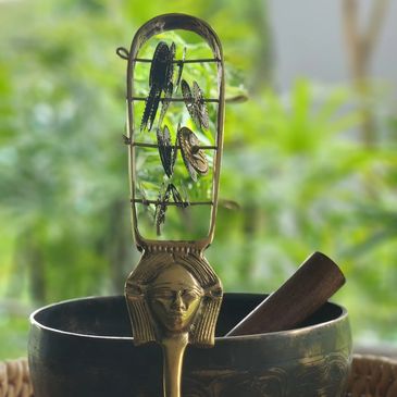 A curation of handmade artifacts support our journey with resonant vibrations, including a rare Hathor sistrum activated in a sacred ceremony in Egypt, sound healing tools tuned to 432 Hz, and a Vesica Piscis pendant from the Magdalene lineage. Light language paintings and thoughtfully selected crystals further amplify the energy, creating a deeply transformative space.